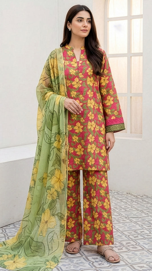 Printed Khaddar 3PC Suit Shirt Fabric: Premium Printed KhaddarLength: 3.0 Meters Dupatta Fabric: Printed KhaddarLength:...